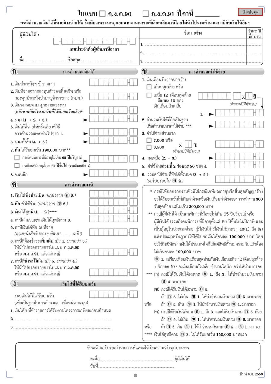 แบบที่ 2) แยกคำนวณภาษีโดยไม่นำไปรวมกับเงินได้อื่นๆ (ใช้ “ใบแนบ ภ.ง.ด. 90/91 กรณีคำนวณเงินได้ที่นายจ้างจ่ายให้ครั้งเดียวเพราะเหตุออกจากงานฯ”) ซึ่งแบบที่ 2 นี้ มักจะมียอดเสียภาษีน้อยกว่าแบบที่ 1 เพราะสามารถหักค่าใช้จ่ายได้เพิ่มเติมนั่นเอง